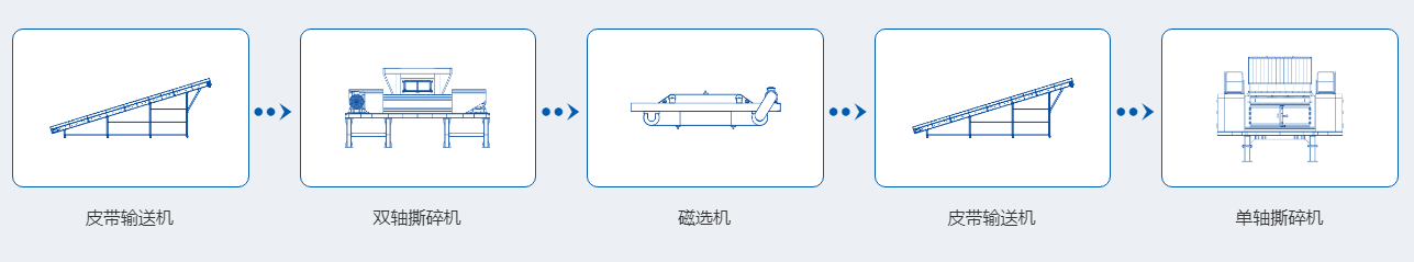 常规处理工艺为:进料皮带输送机将废塑料输送至双轴撕碎机进行破碎,两个旋转的刀具对废塑料进行剪切和撕碎,破碎后的物料经由放置在皮带输送机上方的除铁器对物料中所含导磁性物料进行分选后,再进入单轴细碎机里进行细碎,可根据客户的需求选配合适的筛网。 (此为常规工艺,可按需定制)