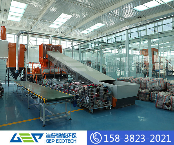 在废纺织物处置方面,废纺织物通过分拣、分类,再经由洁普废纺织物处置生产线进行粉碎处理,顺着皮带传送机被运入车间内打包机进行打包处理。这些破碎处理的物料被转运至下一道处置工序进行处理,实现资源合理化应用。